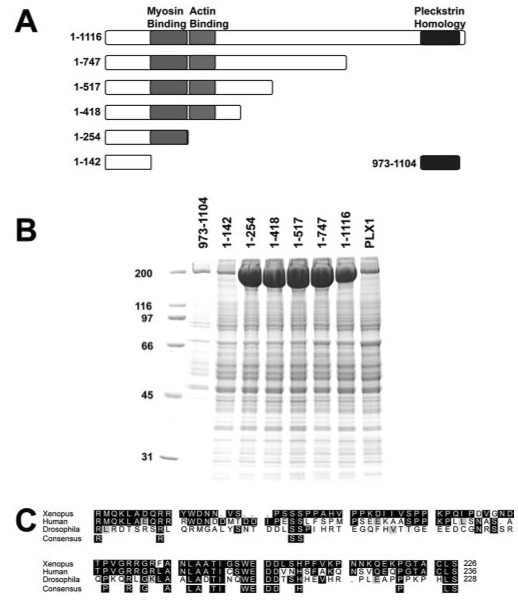 Figure 3. Delineation of myosin II binding region in anillin. (A) Schematic of anillin truncation fragments with minimal myosin binding region, region homologous to actin binding region, and pleckstrin homology domain highlighted. (B) Eluates from affinity columns for each of the fragments of anillin and Polo kinase (PLX1). Myosin II is the prominent band at 200 kDa. (C) Homology align-ment of Xenopus, human, and Drosophila anillin in the myosin binding region. |