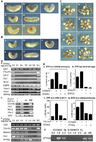 Fig. 3. XPIASy functions as an inhibitor of XSmad2. (A) The effect of XPIASy on embryogenesis. Embryos were injected into the dorsal midline at the four-cell stage with XPIASy mRNA at a concentration of 0.5 ng (a), 1 ng (b), 5 ng (c) or 10 ng (d), or with dominant-negative XSmad2 mRNA at 5 ng (f) or 8 ng (g), and developed until stage 27. (e) Uninjected control. (B) The ventralized phenotype induced by XPIASy is largely rescued by co-injecting with XSmad2, but not with β-catenin. Embryos were injected into the DMZ at the four-cell stage with 1 ng XPIASy (a), 1 ng XPIASy and 0.1 ng XSmad2 (b) or β-catenin at 0.1 ng (c) or 0.5 ng (d). (e) Uninjected embryo. (C) XPIASy inhibits animal cap elongation, mediated by the Smad2/activin pathway. Both blastomeres of two-cell stage embryos were injected with 0.5 ng of XSmad2 (a), XSmad2 and 0.2 pg of activin (b), 0.5 ng of XPIASy (c), XPIASy and activin (d), XSmad2 and XPIASy (e), XSmad2, XPIASy and activin (f), nothing (g), or activin (h). At stage 8, animal caps were dissected and cultured until stage 23. (D) XPIASy inhibits mesoderm marker transcription activated by the Smad2 pathway but only slightly inhibits transcription induced by the Wnt pathway. Semi-quantitative RT-PCR was performed to analyze the effect of XPIASy on transcription of the targets of activin/XSmad2 and Wnt pathways. The mRNAs (0.5 ng) of XSmad2 (a), activin (b) or β-catenin (c) and/or XPIASy were injected into both blastomeres at the two-cell stage. RT-PCR analysis was performed using animal caps as described in the Materials and methods. XPIASy largely reduces the transcription of XSmad2 or activin target genes (Chordin, Mix.2, Xbra1 and Xnr1) but not Smad1/5 target genes (BMP4, Xvent1 and Msx1), (a) while it only slightly reduces the level of β-catenin target genes (Siamois, Xnr3 and Chordin (c). Un, uninjected caps; WE, whole embryos. (E) XPIASy inhibits the transcriptional activity of XSmad2 in luciferase assays using 3TP-luc (a-c) and ARE-luc (d). Reporter plasmid (50 pg) and 0.5 ng of mRNAs of XSmad2 or XPIASy, or both, were injected into both blastomeres of two-cell stage embryos. Luciferase assay was performed using whole embryos (a,c,d) or animal caps (b) in the presence (c) or absence (a,b,d) of activin (0.2 pg) as described in the Materials and methods. (F) XSmad2 and β-catenin regulate expression of XPIASy in positive and negative ways, respectively. The indicated amount of XSmad2 or β-catenin mRNA was injected in the animal side of two-cell stage Xenopus embryos. XPIASy level in animal caps was analyzed as described in the Materials and methods. This PCR-cycle number for XPIASy is higher than that in D. |