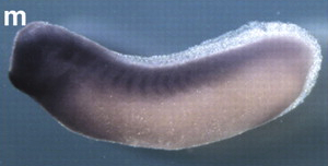 pias4 (protein inhibitor of activated STAT, 4) gene expression in Xenopus laevis embryo, assayed via in situ hybridization, NF stage 26, lateral view, anterior left, dorsal up. |