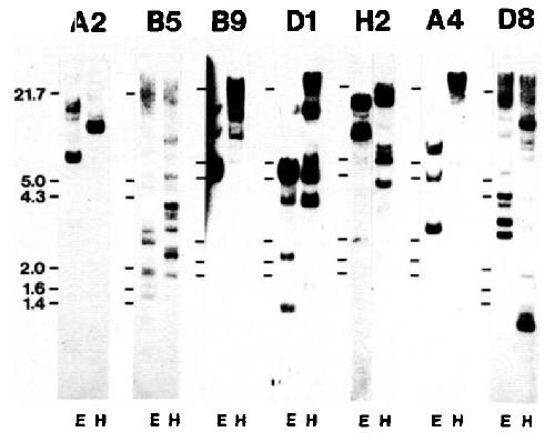 DNA was digested with Eco RI (E) or Hind III (H), separated on 0-8 % agarose gels,