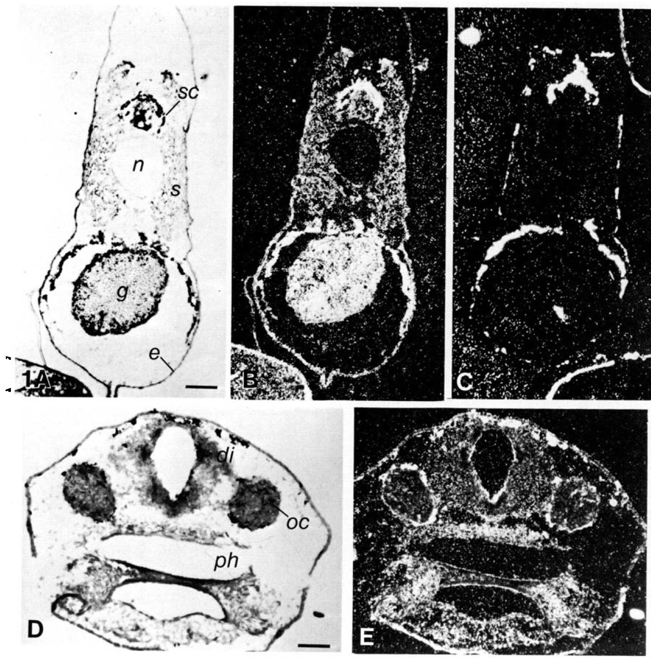 (F) Control hybridization of an adjacent section with pBR322. Abbreviations: e, epidermis; g, gut; n, notochord;/?, pigment granules; s,