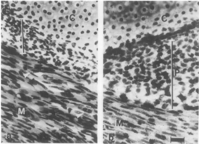 FIG. 1. Photomicrographs of laryngeal autoradiograms. (a) The first panel shows the three tissue types in a sham operated, non hormone-treated juvenile larynx (control). No labeled cells are present in the cartilage (C) or perichondrium (P). Two labeled cells (arrows) can be seenin the muscle (M). Control juveniles were sacrificed 24 hr after a single injection of [3H] thymidine. (b) In larnyx treated 4 days with androgenand then injected with rH]thymidine, both perichondrium and muscle show heavy labeling. Note that the perichondrial layer has also undergonemarked expansion as indicated by the white bracket. Photomicrograph was obtained from the same section level as the control (Fig. la) for comparison. As with the controls, the androgen-treated juveniles were sacrificed 24 hr after injection of the radiolabeled nucleotide. Bar: