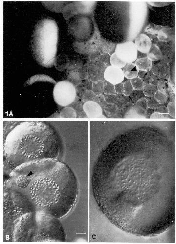 living pre-vitellogenic oocyte, showing the mitochondrial cloud (arrowhead). Bar, 25 fim.