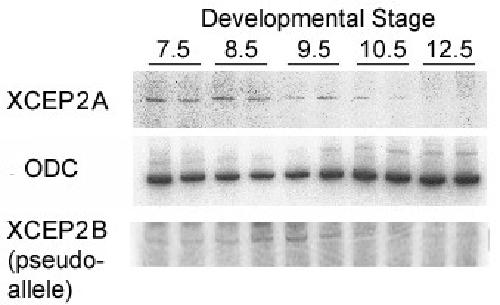 Figure 2. Temporal regulation of XCEP2 during pre-neurula stages of embryonic development. Semi-quantitative RT-PCR was conducted on equivalent amounts of RNA derived from the indicated developmental stages. XCEP2A was amplified using XCEP2A forward and reverse primers (see Methods). Ornithine Decarboxylase (ODC) serves as a loading control (middle panel). RT-PCR amplification to reveal expression of the alternative pseudoallele (XCEP2B), using XCEP2B forward and reverse primers, is shown in the lower panel.