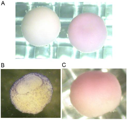 Figure 3. Spatial Localization of XCEP2 mRNA. (A) Animal pole view in situ hybridization of embryos fixed at late blastula stage with digoxygenin-labeled antisense XCEP2A antisense probe exhibit diffuse staining across the animal region of the embryo (right). An XCEP2A sense probe served as a negative control, and showed minimal background staining (left). (B) A blastula stage embryo, cut to reveal a cross-section, reveals the animal/vegetal gradient of antisense XCEP2 probe. The blastocoel cavity is visible in the upper portion of this embryo. (C) A side view of an antisense XCEP2A probed embryo, revealing an animal (top) to vegetal (bottom) gradient of staining.