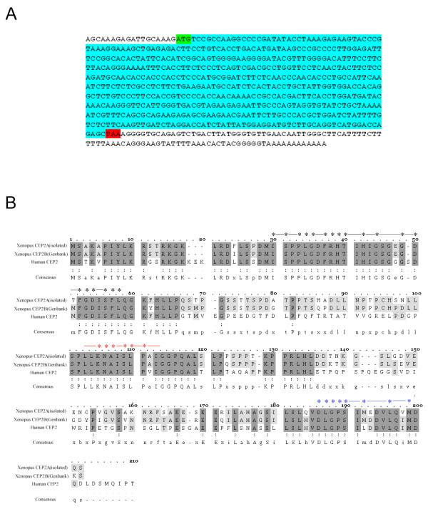 Figure 1. XCEP2 Nucleic Acid and Amino Acid Sequences. (A) The nucleic acid sequence of the XCEP2A cDNA is shown. Sequences encoding the start methionine (green), the stop codon (red) are indicated. The protein coding region is shown in blue. (B) Amino acid sequences of the two Xenopus pseudoalleles of CEP2, along with the mammalian (human) sequence, are shown. Asterisks indicate highly conserved residues within the CRIB domain (black asterisks, lines), the CI domain (red asterisks, lines) and the CII domain (blue asterisks, lines) in the CEP-2 protein. Dark gray shading indicate residues conserved in all three species; light gray areas indicate residues that are conserved between two of the three species listed. Vertically oriented pairs of dots (:) indicate positions where amino acid identity is conserved in all three sequences.