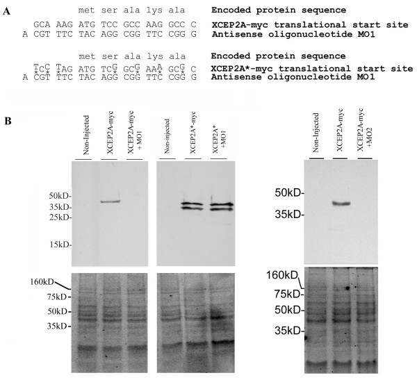 Figure 5. Antisense XCEP2 morpholino oligonucleotides specifically inhibit translation from XCEP2 mRNA. (A) Schematic diagram indicating mutations (designated by asterisks) in the morpholino target site of XCEP2*-myc mRNA that would be expected to inhibit strong interactions with the antisense XCEP2 morpholino (MO1). (B) 0.7 ng of mRNA encoding myc-tagged XCEP2 (either the normal XCEP2-myc or the mutated XCEP2*-myc) was injected alone or in combination with 80 ng of antisense XCEP2 morpholino oligonucleotide (MO1) into the animal pole of 1-cell embryos. XCEP2 protein was detected in embryo extracts (prepared at stage 8.5–9) by Western Blotting using anti-myc monoclonal antibody 9E10 (upper panels). Equivalency in protein loads in the Western Blot lanes are indicated by the similarity in staining intensity of protein bands in the corresponding SYPRO Ruby-stained gels in the lower panels.