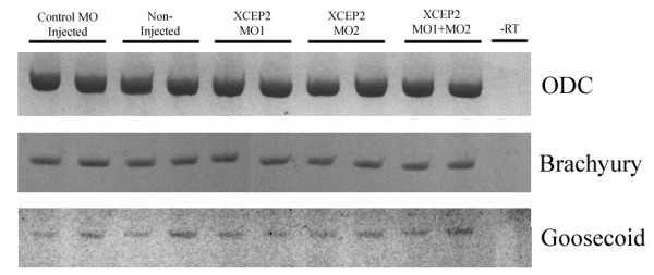 Figure 7. Antisense XCEP2 morpholino oligonucleotides do not inhibit mesodermal induction. Semiquantitative RT-PCR analysis was conducted on duplicate RNA samples using primers for Brachyury (a pan-mesodermal marker), goosecoid (a dorsal mesodermal marker) and ornithine decarboxylase (ODC, used as loading control). For control and morpholino-injected conditions, 100 ng of morpholino oligonucleotide was injected into the animal region of 1-cell stage embryos.