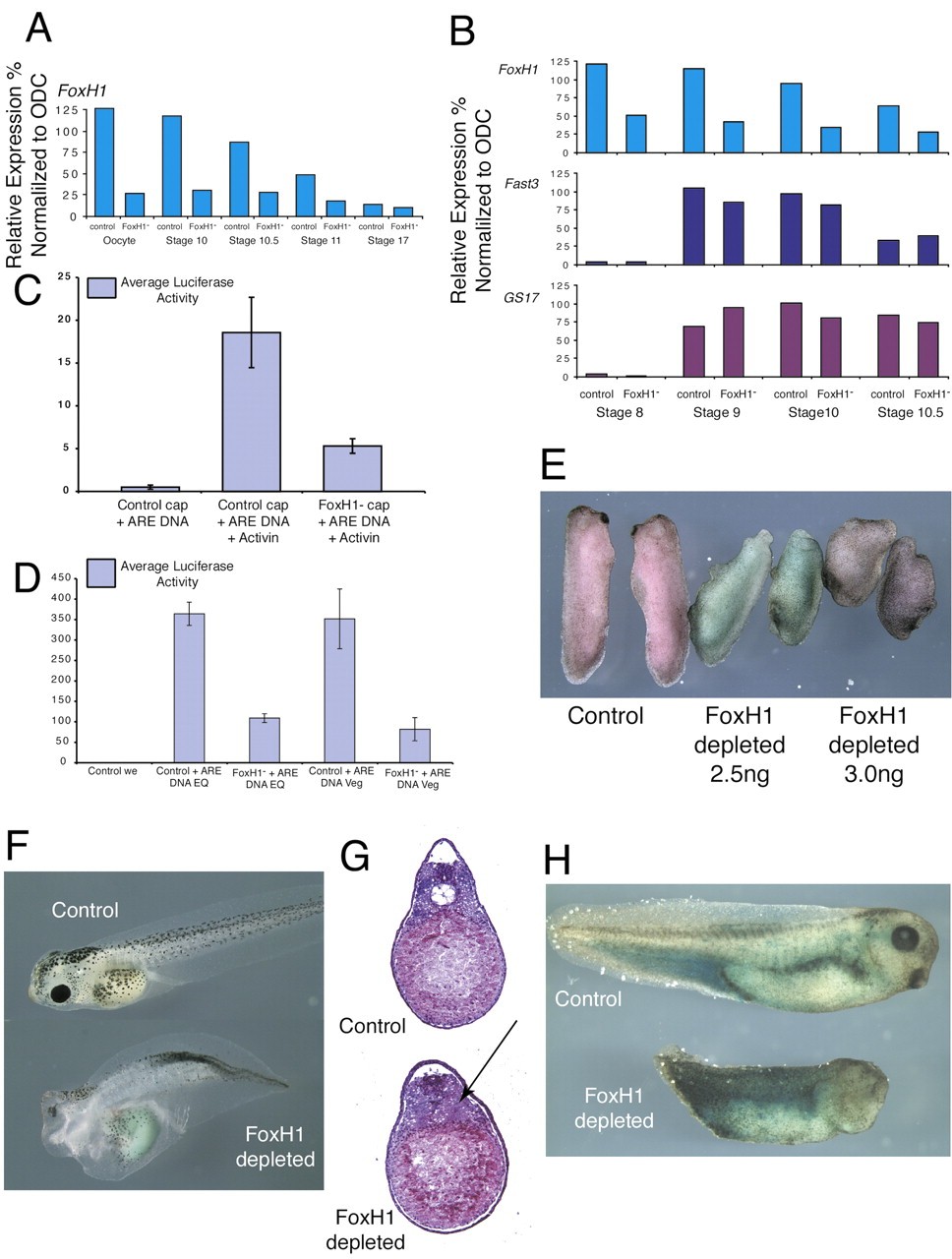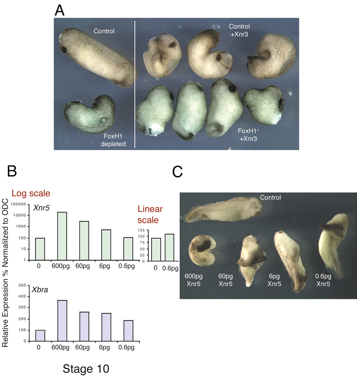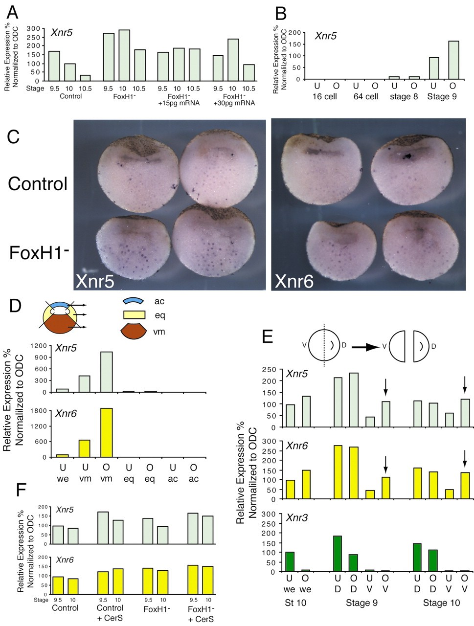 FoxH1 (Fast1) was first characterized as the transcriptional partner for Smad proteins. Together with Smad2/4, it forms the activin response factor (ARF) that binds to the Mix.2 promoter in Xenopus embryos. Foxh1 is expressed maternally in Xenopus. Depletion of maternal Foxh1 mRNA results in abnormalities of head and dorsal axis formation. We show that FoxH1 is required, together with XTcf3/beta catenin, to activate the zygotic expression of the nodal gene, Xnr3 in a Smad2-independent manner. In contrast, maternal FoxH1 acts as an inhibitor of Xnr5 and 6 transcription, preventing their upregulation on the ventral side of the embryo, by the maternal T-box transcription factor VegT. We conclude that maternal FoxH1 has essential, context-dependent roles in regulating the pattern of zygotic gene expression in the early embryo.