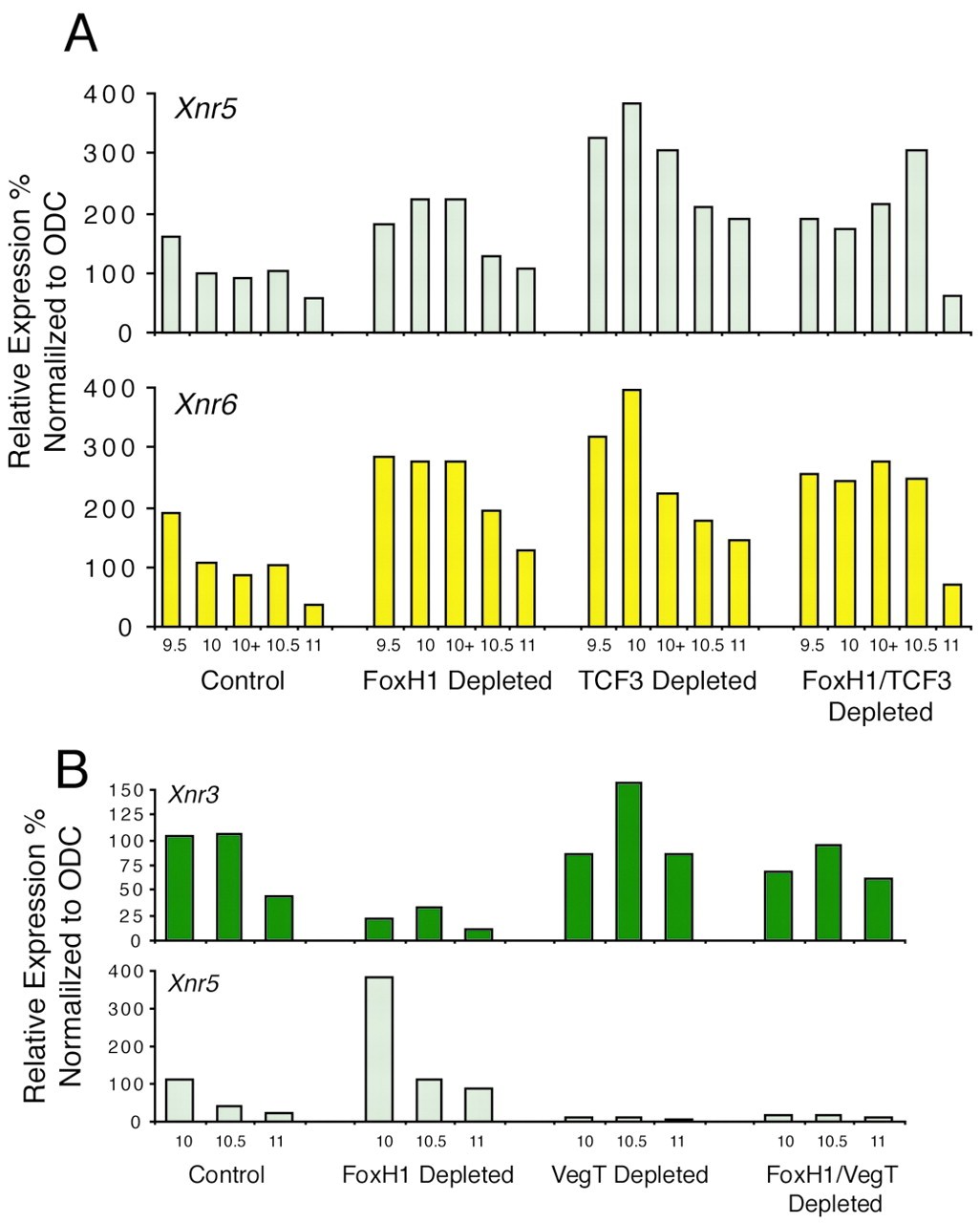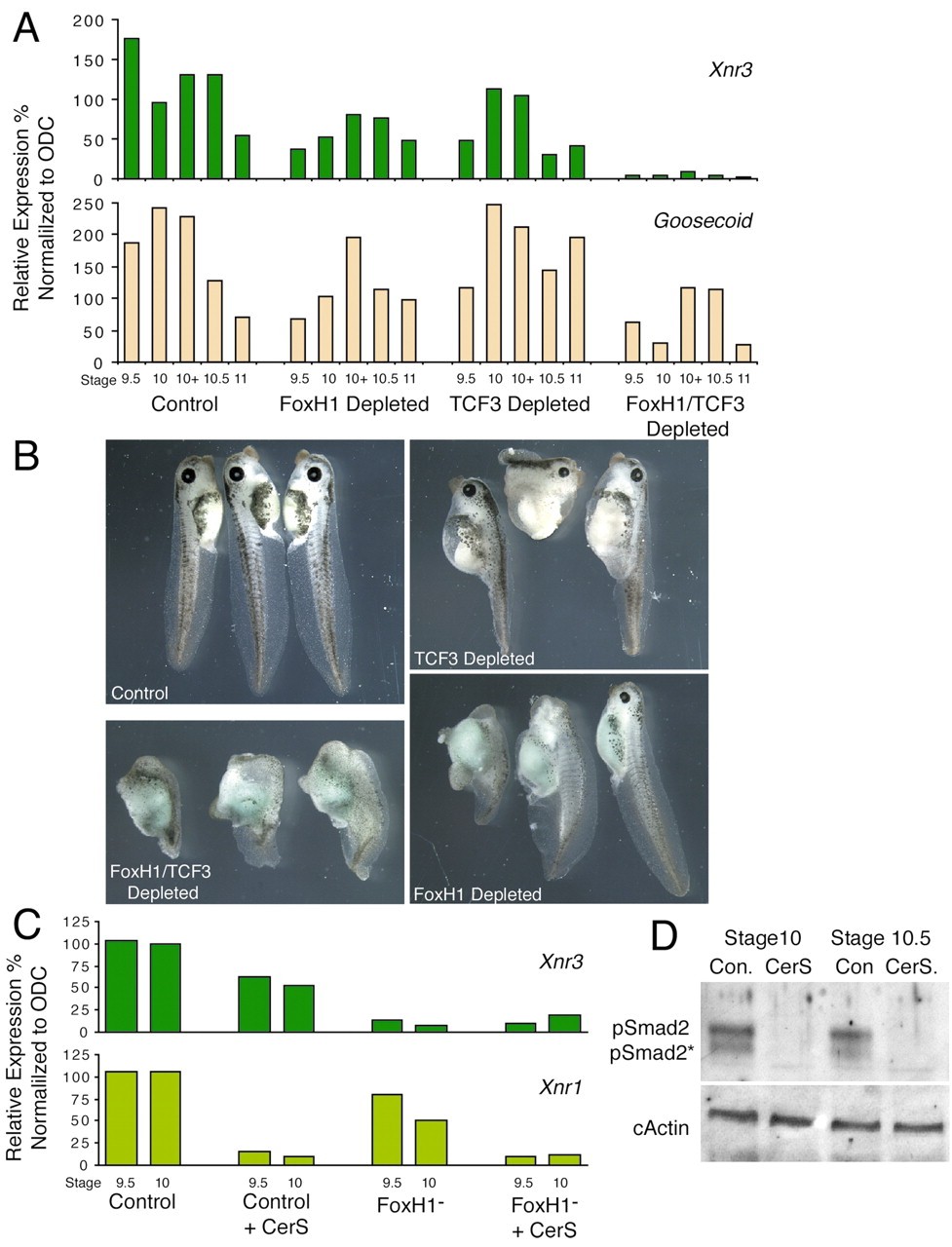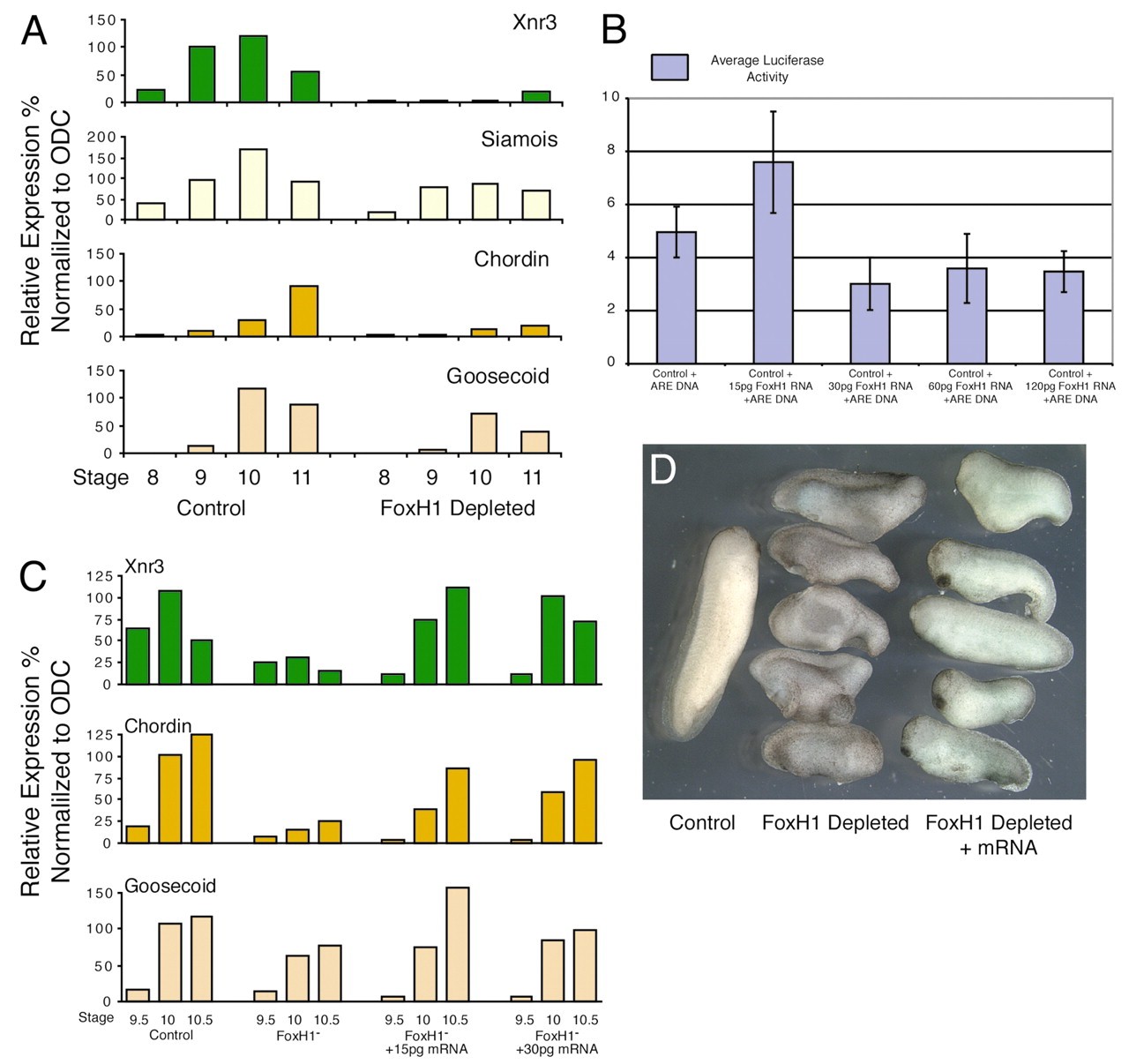 FoxH1 (Fast1) was first characterized as the transcriptional partner for Smad proteins. Together with Smad2/4, it forms the activin response factor (ARF) that binds to the Mix.2 promoter in Xenopus embryos. Foxh1 is expressed maternally in Xenopus. Depletion of maternal Foxh1 mRNA results in abnormalities of head and dorsal axis formation. We show that FoxH1 is required, together with XTcf3/beta catenin, to activate the zygotic expression of the nodal gene, Xnr3 in a Smad2-independent manner. In contrast, maternal FoxH1 acts as an inhibitor of Xnr5 and 6 transcription, preventing their upregulation on the ventral side of the embryo, by the maternal T-box transcription factor VegT. We conclude that maternal FoxH1 has essential, context-dependent roles in regulating the pattern of zygotic gene expression in the early embryo.