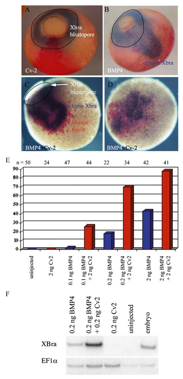 Fig. 4. Elevation of BMP4 activity by Cv-2. (A-D) Injection of Cv-2 (A), BMP4 (B) or BMP4 plus Cv-2 mRNA (C,D) with fluorescein dextran lineage tracer into a single animal pole blastomere at the 32-cell stage embryo, and Xbra expression detected at stage 10.5. Fluorescein dextran is detected in red, and Xbra in blue, with the normal expression domain around the blastopore lip indicated with a black ellipse. Ectopic BMP4 with or without Cv-2 induces ectopic expression of Xbra, either co-extensive with the normal expression around the blastopore lip (B,C) or as an isolated patch (D). (E) Summary of the effects of BMP4 and Cv-2 injections on the proportion of embryos with ectopic Xbra expression (%, y-axis). For each amount of BMP4 RNA, co-injection of Cv-2 RNA increases the induction of Xbra expression. The number of embryos analysed are indicated at the top of the chart. (F) Injection of BMP4 and/or Cv-2 mRNA at the one-cell stage embryo, followed by excision of animal caps at stage 8-9, and RT-PCR analysis of Xbra transcripts at stage 10.5. Quantitation with a phosphoimager reveals that Xbra expression is fourfold higher in BMP4 plus CV-2 injected animal caps than with BMP-4. Cv-2 alone does not induce Xbra expression.