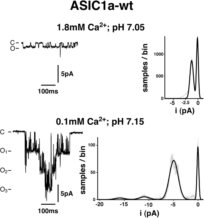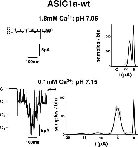 Figure 2. . Apparent single channel amplitude of ASIC1a depends on extracellular Ca2+. (Top) Single channel current amplitude of ASIC1a with 1.8 mM Ca2+. Left, representative segment of an outside-out patch-clamp recording. The extracellular test solution contained 140 mM NaCl and 1.8 mM CaCl2; pH was 7.05. Right, amplitude histogram representing the respective pool of segments of recordings as shown on the left; 299 individual events contributed to the histogram. Amplitude distribution was fitted to a sum of Gaussian functions. Single channel current amplitude was −1.3 ± 0.4 pA (mean ± σ; n = 4 individual patches). Holding potential was −100 mV. (Bottom) Single channel current amplitude of ASIC1a with 0.1 mM Ca2+. Left, representative segment of an outside-out patch-clamp recording. Right, amplitude histogram; 165 individual events of level 1 (corresponding to one open channel) contributed to the histogram. Single channel current amplitude was −4.9 ± 0.9 pA (n = 3 individual patches). Holding potential was −100 mV.