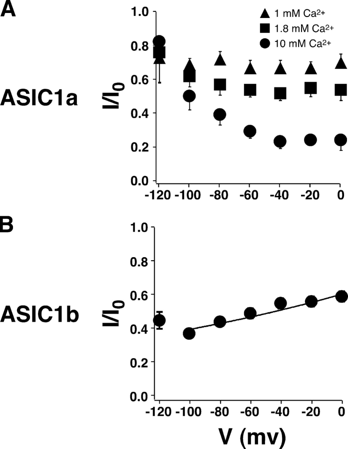 Figure 3. . Voltage dependence of Ca2+ block in ASIC1. (A) Voltage dependence of Ca2+ block of ASIC1a. Current measured with 1 mM, 1.8 mM, or 10 mM Ca2+ was normalized to the current measured with 0 mM Ca2+ (IxCa/I0Ca) at a given holding potential (n = 8). (B) Voltage dependence of Ca2+ block in ASIC1b. Current measured with 10 mM Ca2+ was normalized to the current measured with 0 Ca2+. Fit of the data from 0 mV to 100 mV to a Boltzmann function is represented by the line and gave a δ value of 0.054 ± 0.007 (n = 9).