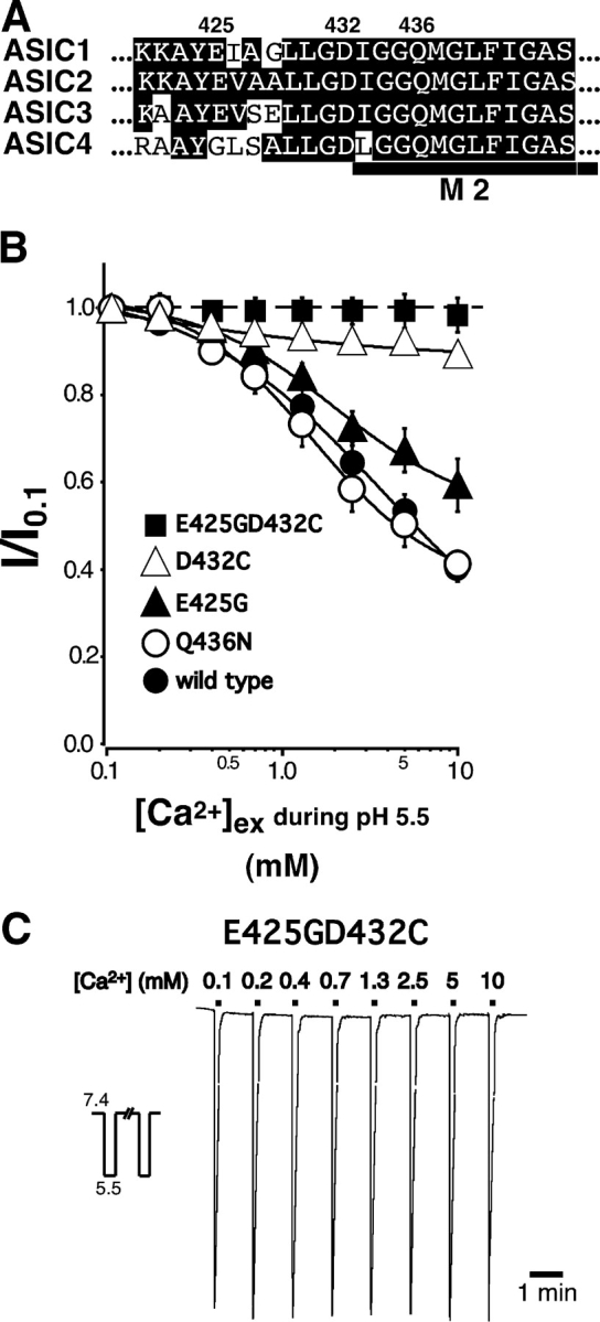 Figure 4. . Combined mutation of glutamate 425 and aspartate 432 of ASIC1a abolishes Ca2+ block. (A) Amino acid sequences of the predicted second transmembrane domain M2 of ASICs in the one-letter code. Amino acids in M2 are identical between ASIC1a and ASIC1b. The position of M2 is indicated by the bar. (B) Dose–response curves for Ca2+ block of ASIC1a channels containing the E425G, the D432C, the Q436N, or the E425GD432C substitution. Recordings were obtained using the same protocol as described for Fig. 1. Current that was blocked by 10 mM Ca2+ was 59 ± 3% (n = 12) for Q436N, 41 ± 6% (n = 12) for E425G, 11 ± 2% (n = 14) for D432C, and 2 ± 4% (n = 14–16) for E425GD432C. Lines represent a fit to a logistic function (Eq. 1) of the mean data for individual Ca2+ concentrations. Dose–response curve for Ca2+ block of ASIC1a wild type from Fig. 1 is shown for comparison. Peak current amplitudes with 0.1 mM Ca2+ were 17.9 ± 3.1 μA for Q436N, 6.5 ± 1.0 μA for E425G, 5.8 ± 0.5 μA for D432C, and 7.7 ± 1.0 μA for E425GD432C. (C) Representative trace of ASIC1aE425GD432C currents elicited by application of pH 5.5 and varying concentrations of extracellular Ca2+. The trace was obtained by averaging two original traces as described for Fig. 1 A. Duration of solution application and concentration of NaCl and CaCl2 as in Fig. 1 A.