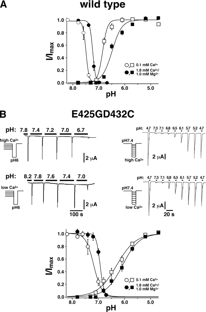 Figure 6. . Channels containing the double substitution E425GD432C still show Ca2+-dependent shifts of steady-state inactivation and pH activation curves. (A) Dose–response curves for steady-state inactivation by H+ and for activation by H+ with different Ca2+ concentrations for ASIC1a wild type. The curve for steady-state inactivation was published previously (Babini et al., 2002). For steady-state inactivation curves, oocytes were preincubated for 2 min at a conditioning pH varying between 8.2 and 6.7. After this preincubation, available channels were activated by switching to a solution of pH 6.0 containing 140 mM NaCl, 1.8 mM CaCl2/1.0 mM MgCl2. The preincubation solution contained 140 mM NaCl and either 1.8 mM CaCl2/1.0 mM MgCl2 (•) or 0.1 mM CaCl2 (○). The preincubation solution with 0.1 mM CaCl2 also contained 0.1 mM niflumic acid to block the large conductance induced in oocytes by divalent-free extracellular solutions. For H+ activation curves, the preincubation solution contained 140 mM NaCl, 1.8 mM CaCl2/1.0 mM MgCl2; pH 7.8. Every 30 s, a test solution with a pH ranging from 7.4 to 4.7 was applied for 3 s. The test solution contained 140 mM NaCl and either 1.8 mM CaCl2/1.0 mM MgCl2 (▪) or 0.1 mM CaCl2 (□). (B) Top left, representative traces of ASIC1aE425GD432C currents showing steady-state inactivation at two different Ca2+ concentrations. Top right, representative traces of ASIC1aE425GD432C currents showing activation by H+ at two different Ca2+ concentrations. pH was as indicated. Duration of solution application and concentration of NaCl and CaCl2 were as described in A. Bottom, dose–response curves for steady-state inactivation and activation with different Ca2+ concentrations for ASIC1aE425GD432C.