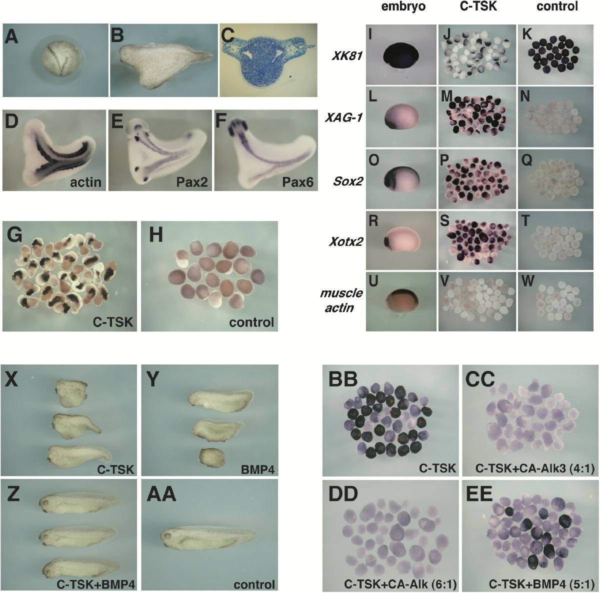 Fig.2. C-TSK Functions as a BMP Antagonist in Xenopus(AâF) C-TSK mRNA (400 pg) was injected into a ventral vegetal blastomere at the 8-cell stage and embryos were developed until stages 20 (A) and 31 (B). A transverse section (C) through the trunk region. In situ hybridization with actin (D), Pax2 (E), Pax6 (F) at stage 31.(G and H) VMZ explants injected with C-TSK were dissected at stage 10, cultured until stage 24, and subjected to in situ hybridization with muscle actin.(IâW) Animal cap assay.(I, L, O, R, and U) Marker expression in normal embryos at stage 21/22. Animal caps were prepared from stage 9 embryos that had been injected with 1.6 ng TSK (J, M, P, S, V) or control (K, N, Q, T, W). Animal caps were harvested at the time equivalent to stage 21/22 and hybridized with XK81 (IâK), XAG-1 (LâN), Sox2 (OâQ), Xotx2 (RâT), and actin (UâW) probes.(XâAA) Effect of C-TSK and BMP4 on dorsal-ventralization. After injection of the indicated constructs into 4 vegetal blastomeres at 8-cell stage, the effects on the D-V patterning were scored.(X) 1 ng of C-TSK (1 ng) per blastomere (DAI 6â7).(Y) 0.5 ng of BMP4 (DAI 0â3).(Z) 1 ng of C-TSK + 0.5 ng of BMP4 (DAI 4â5).(AA) 1 ng of C-TSK + 1 ng of BMP4 (DAI 0â2).(BB-EE) Effect of inhibition of BMP signal on TSK activity. After animal caps were prepared from stage 9 embryos that had been injected with 1.6 ng of C-TSK (BB), 3.2 ng of C-TSK + 0.8 ng of CA-Alk3 (CC), 4.8 ng of C-TSK + 0.8 ng of CA-Alk3 (DD), 2.5 ng of C-TSK + 0.5 ng of BMP4 (EE), expression of XAG-1 was analyzed. |
