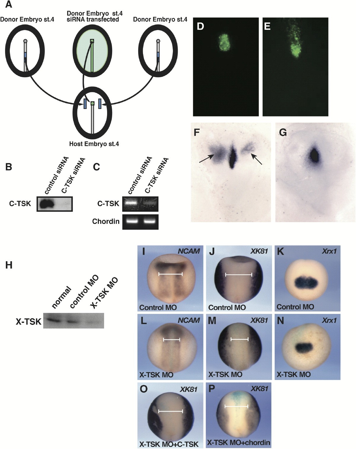 Fig.5. Gene Silencing of TSK Results in the Inhibition of Organizer Formation(A) Transplantation scheme of siRNA experiments. A chick embryo was electroporated with siRNA and Fluorescein Dextran at stage 4 and the excised node was implanted into the equivalent position of the host embryo. The middle primitive streaks from another two donor embryos were excised and grafted halfway between the node and the lateral edge of the area pellucida of the host embryo.(B) COS-7 cells were transfected either with control or C-TSK siRNA plus a C-TSK-Myc expression plasmid. The supernatants were blotted and level of C-TSK protein was assessed.(C) Hensen's node at stage 4 was electroporated either with control or C-TSK siRNA. After excision of the nodes, it was implanted into the equivalent position of the host embryos. After 6 hr incubation, the implanted nodes were excised, and the level of C-TSK or chordin mRNA was determined by RT-PCR.(D and E) Fluorescein-labeled cells in host embryos before (D) or after (E) incubation.(F and G) After the performance of experiments according to the scheme in (A), the ectopic induction of chordin was examined by in situ hybridization.(F) Control siRNA. In the case of control siRNA, the middle primitive streak induced ectopic expression of chordin in 8/18 (44%), which is similar to embryos without electroporation, 11/25 (44%).(G) C-TSK siRNA. In the case of C-TSK siRNA, the middle primitive streak induced ectopic expression of chordin in 6/24 (25%).(H) X-TSK MO reduces X-TSK protein level. X-TSK or control MO was coinjected with mRNA of Myc-tagged X-TSK containing 5â² UTR into animal blastomeres of Xenopus embryos. Animal caps were dissected at stage 8â9 and harvested after 3 hr incubation. The level of X-TSK protein was analyzed by Western blotting using an anti-Myc antibody.(IâP) X-TSK MO reduces the area of neuroectoderm with an associated increase of epidermis. After injection of 10 ng of the indicated morpholino, its effect on expression of NCAM, XK81, or Xrx1 was analyzed by in situ hybridization.(O) 240 pg of C-TSK mRNA was coinjected.(P) 120 pg of Xenopus chordin mRNA was coinjected. The width of neuroectoderm at the anterior side of trunk was indicated by white lines. X-TSK MO resulted in 34% reduction of the width of neuroectoderm. This reduction was largely rescued by C-TSK (86%) or Xenopus chordin (102%). |