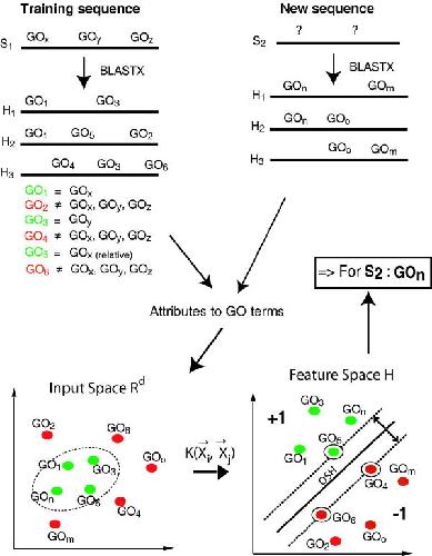 Figure 2. General prediction scheme: The training sequences (S1) with known function (GOx, GOy, GOz) were searched across the protein databases, yielding hits with molecular function GO terms (GO1, GO2, GO3, GO4, GO5, GO6) and their features (see methods), sketched as dots in a two-dimensional feature space. If GO terms of the hits compared to GO terms of the query, they were classified as +1 (correct, green), and -1 otherwise (red). The classifier (SVM) separated the classes by an optimal separating hyperplane (OSH). Unknown sequences (S2) were searched in the same manner and the GO terms (GOn, GOm, GOo) were extracted. Their features were calculated and mapped into the feature space. The corresponding labels were assigned (correct/false).