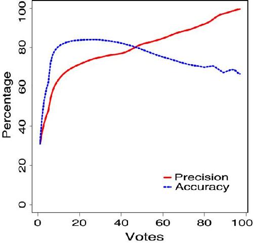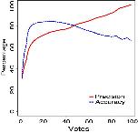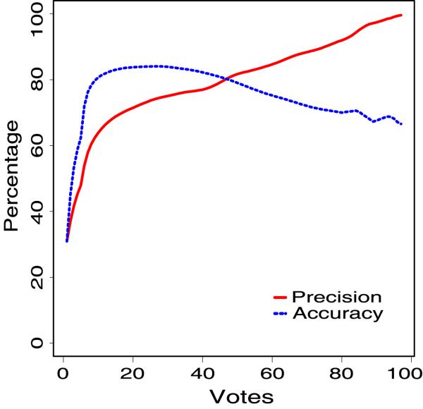 Figure 3. Accuracy and precision against the number of votes: The accuracy and precision values of the test data is plotted against the number of votes. An increasing number of votes increased the precision monotonically. Higher stringency yielded a sparse lowering of the accuracy due to the rate of false negatives. The relation between the precision and the number of votes was used for assigning confidence values for new predictions.