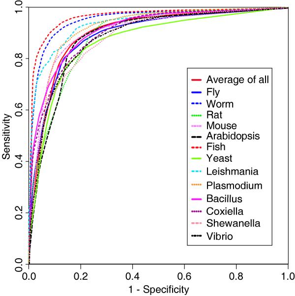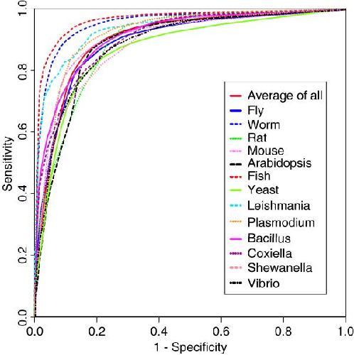 Figure 4. ROC plots for the classifiers performance: ROC plots for the results of all organisms tested and the average of all test sequences. The classification performance for different classes of organisms like multi-cellular eukaryotes, single-cell eukaroyotes and the prokaryotes were compared.