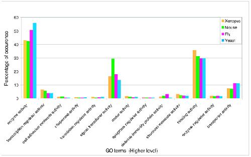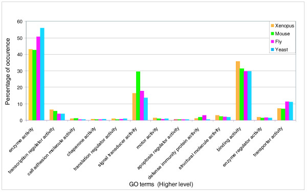 Figure 6. Comparison of GO slims between Xenopus, fly, yeast and mouse: Distributions of higher-level GO terms (,,GO slim, see text) for Xenopus, fly, yeast and mouse. The sum of all high-level terms may exceed the total number of the annotated terms, since some terms may have more than one high-level parent terms due to multiple paths.