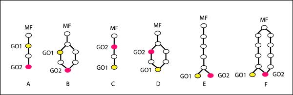 Figure 1. A schematic representation of possible GO term relationships: A: GO1 is a parent of GO2 in a single path relationship. B: GO1 is a parent of GO2 in a multiple path relationship. C: GO1 is a child of GO2 in a single path relationship. D: GO1 is a child of GO2 in a multiple path relationship. E: GO1 and GO2 are siblings in a single path relationship. F: GO1 and GO2 are siblings in a multiple path relationship. MF denotes the molecular function node (root).