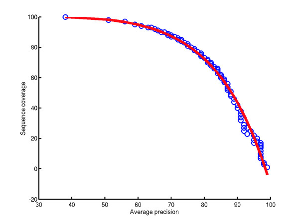 Figure 5. Precision against the sequence coverage: Average precision against sequence coverage for all 13-test organisms (circles). The red line denotes a fitting curve.