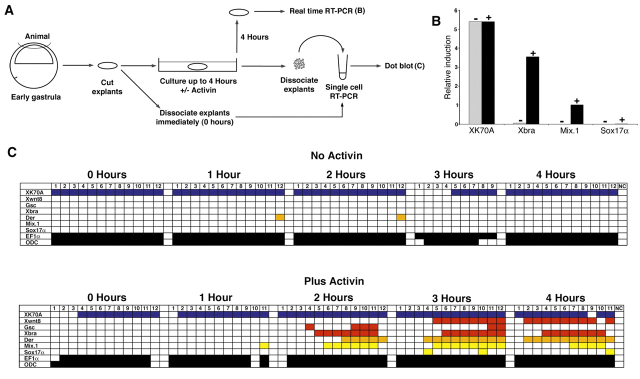 caps shows high levels of expression of XK70A and Xbra, lower levels of Mix.1, and almost no induction of Sox17α after 4 hours. (C) The gene