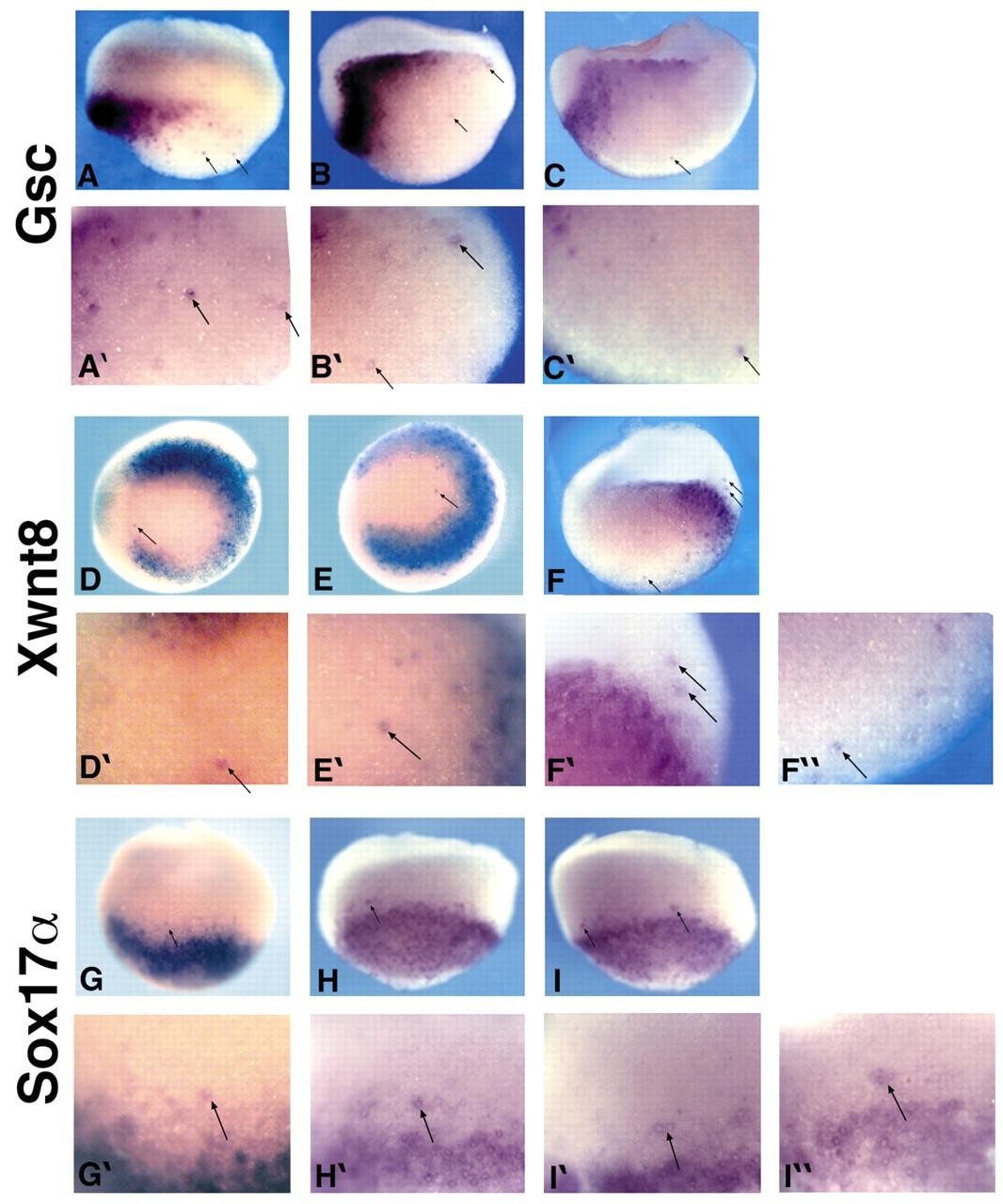Fig. 1. Rogue cells express Gsc, Xwnt8 and Sox17α in the Xenopus early gastrula. In situ hybridization using Gsc, Xwnt8 or Sox17α antisense probes on bisected embryos at early gastrula stage 10-10.5. (A-C) The majority of Gsc expression is seen in dorsal mesendoderm; however, some expressing cells (arrows) are seen in the ventral marginal zone (Bâ²) and the vegetal mass (Aâ²-Câ²). (D-F) Xwnt8 expression is seen in the ventral marginal zone, although some expressing cells are seen in the dorsal marginal zone (Dâ²) and in the vegetal mass (Eâ²,Fâ²). (G-I) Sox17α expression is strongest in the vegetal mass; however, discontinuous expression is also seen in the marginal zone (Gâ²-Iâ²). Dorsal is towards the left, animal towards the top. (A,D,E,G,H,I) The outside surface of embryo; (B,C,F) the cut surface of embryo. (Aâ²-Iâ²) Higher magnification of the cells indicated in A-I. |