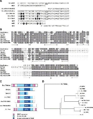 Fig. 1. Characterization of a Xenopus tribbles-like (Xtrb2) gene. (A) Portions of the sequences, centered on the start codon (underlined), of X. tropicalis (X.t.) and X. laevis (X.l.) Xtrb2 cDNAs, together with the antisense morpholino oligonucleotides used in this paper. Nucleotides that differ from the Xenopus laevis cDNA2 (Xtrb2-L) sequence are highlighted. (B) Amino acid sequence alignment of Drosophila Tribbles and Tribbles-like proteins in Ciona, Xenopus, and human in the kinase subdomains VIA-IX. Identical amino acid residues (in more than half of the sequences) are highlighted. The arrows indicate the serine/threonine kinase subdomains. The short arrow indicates the position of the junction between exons 2 and 3 of human TRB2. The asterisk indicates the lysine residue that is mutated to an arginine in the Drosophila TrblK266R allele. (C) Schematic drawings of Tribbles family proteins. % identities in the kinase domains of Xtrb2-L and the other family members are indicated. Accession numbers are H.s. TRB2, D87119; H.s. TRB1, AF205437; H.s. TRB3, NM025195; C.i. Trbl, AK113810. The PESTfind scores of potential PEST sequences are above +5 except in the C-terminus of Drosophila Tribbles and Ciona Trbl (+2.02 and +2.92, respectively). (D) Phylogenetic tree of the Tribbles protein family. |