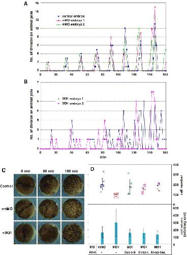 Fig. 6. Slow and asynchronous cleavage caused by suppression of Xtrb2 translation. (A, B) Embryos were either untreated or injected with mMO or MO1 and were subjected to time-lapse recording after the first cell division (when t = 0). The numbers of new cleavage furrows at each time point on the animal half of the embryos were counted and plotted during the time course. (C) Time-lapse images of the embryos at 0, 80, and 160 min. (D) Rescue of the delayed cell division phenotype by Xtrb2 RNA. Morpholino oligonucleotides (0.25 pmol) were injected into a single tier A blastomere of Xenopus embryos at the 32-cell stage, together with fluoresceinâdextran and Xtrb2-L or Xtrb2-S RNA, either individually (100 pg RNA) or in combination (50 pg of each RNA). Cells were dissociated and fixed at stage 9. The numbers of fluorescein-positive cells in each animal cap were counted, and their diameters were measured. The upper plot shows cell numbers derived from two independent experiments, and the bars indicate the average cell numbers per animal cap (±SD). The volumes of cells were estimated from their diameter, and their averages (±SD) are plotted in arbitrary units. The experiment involving coinjection of Xtrb2-L and Xtrb2-S RNA together with MO1 was carried out once. Xtrb2 RNAs rescue the cleavage defect caused by MO1 (P < 0.001). |