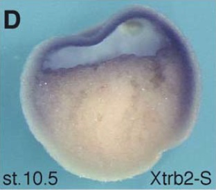 trib2 (tribbles pseudokinase 2) gene expression in bissected Xenopus laevis embryo, assayed via in situ hybridization, NF stage 10.55, lateral view, animal up, dorsal right. |
