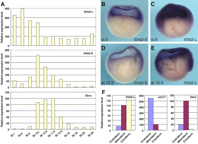 Fig. 2. Expression profile of Xtrb2 transcripts during early development of Xenopus laevis. (A) Expression profile of Xtrb2-S, Xtrb2-L, and Xbra at stages from fertilization to stage 24. The numbers are normalized against plakoglobin expression. (BâE) Whole mount in situ hybridization of Xtrb2-S (B, D) and Xtrb2-L (C, E) at stage 9 (B, C) and stage 10.5 (D, E). (F) Relative expression levels of Xtrb2-L in the three germ layers at stage 9 assayed by quantitative RTâPCR. Xtrb2-L is highly expressed in ectoderm and mesoderm, while sox17 and Xbra were expressed predominantly in endoderm and mesoderm, respectively. Data are normalized against the amount of input RNA. |