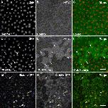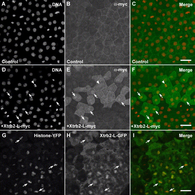 Fig. 4. Subcellular localization of the Xtrb2-L protein. (AâF) Stage 10 embryos either untreated (AâC) or injected with RNA encoding myc-tagged Xtrb2-L (DâF) were stained with anti-myc antibody (B, E) and the DNA dye SYTOX green (A, D). Merged images are also shown (C, F: green for anti-myc and red for DNA). Myc-tagged Xtrb2 was detected in the cytoplasm and, in some cells, in the nucleus (arrows). Weak staining was also observed in the region of the mitotic spindle (arrowhead). (GâI) A frame from a confocal movie of GFP-tagged Xtrb2-L expressed in live animal cap cells. RNA encoding histone H2B-YFP was injected to visualize nuclei. (G) Histone H2B-YFP. (H) Xtrb2-GFP. (I) Merged images (red for YFP and green for GFP). Xtrb2-GFP is associated with mitotic spindles (arrows) and with nuclei. Scale bar is 50 μm (AâF) or 40 μm (GâI). |