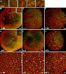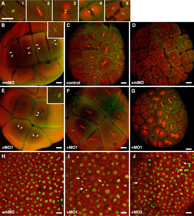 Fig. 7. Phenotypes of MO-injected embryos. The figure shows confocal images of embryos subjected to whole-mount staining using an anti-β-tubulin antibody (red) and SYTOXgreen DNA dye (green). Embryos are at early blastula stages (BâG) or midgastrula stage 11 (HâJ), either untreated or injected with 7 pmol of MOs at the 1-cell stage as indicated. 3D projections of a confocal Z series sections are shown. (A) Mitotic spindles in control embryos at prophase (1), metaphase (2), early anaphase (3), late anaphase/telophase (4), and telophase (5). Note that cytokinesis has started in (4) and that the microtubule organizing center (MTOC) has duplicated before completion of cytokinesis in (5). (B) Duplication of MTOCs has occurred (arrows) in cells in which cytokinesis is under way. Inset is a closeup view of the region marked by the black rectangle. (C, D) Control (C) and mMO-injected (D) embryos undergo synchronous cell division. (E) Cells of embryos injected with MO1 have duplicated their MTOCs (arrow), but cytokinesis has not yet begun. Inset is a magnified view of the region marked by the black rectangle. (F, G) Cells are at different stages of mitosis in embryos injected with MO1. (HâJ) Confocal images of cells in the animal pole region of Xenopus embryos at midgastrula stage 11. (H) No abnormal mitoses are observed in an embryo injected with mMO. (I) Abnormal tripolar spindles (arrows) are observed in embryos injected with MO1. (J) Binucleate cells (arrows) are observed in embryos injected with MO2. Scale bar is 100 μm (AâG) or 25 μm (HâJ). |