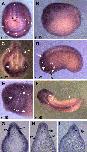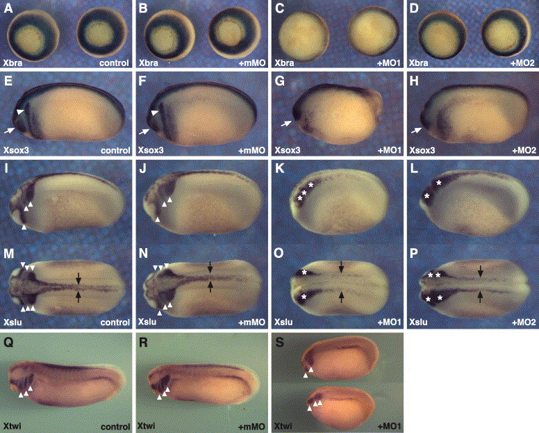 Fig. 8. Phenotypes of embryos injected with MO1 or MO2. Control embryos or embryos injected with antisense morpholino oligonucleotides were fixed and subjected to in situ hybridization using the indicated probes. (AâD) Xbra expression at stage 11. Embryos injected with MO1 (C) had reduced levels of Xbra expression, and gastrulation movements were delayed in comparison with control and mMO-injected embryos (A, B). MO2-injected embryos (D) also showed slight retardation of gastrulation. (EâH) Sox3 expression at stage 22. In control and mMO-injected embryos (E, F), Sox3 is expressed in presumptive lens ectoderm (PLE, arrows) and the dorsolateral placode (DLP, arrowheads). In contrast, Sox3 expression is absent or greatly reduced in the PLE and DLP of MO1- or MO2-injected embryos. (IâP) Slug expression at stage 22. Dorsal (IâL) and lateral (MâP) views are shown. Arrowheads (I, J, M, N) or asterisks (K, L, O, P) indicate cephalic neural crests. Note the absence of cephalic neural crest migration and the gap between rows of Xslug expression in the trunk (arrows) in MO1- and MO2-injected embryos. (QâS) Twist expression at stage 26. Cephalic neural crest migration (arrowheads) is abnormal in MO1 embryos. |