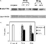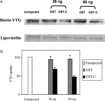 Fig. 5. xARH dominant negative mutant inhibits vitellogenin endocytosis in oocytes. GST-C or GST protein was injected into stage III oocytes and the oocytes incubated in medium containing biotinylated VTG. (A) The internalized biotinylated VTG was detected using streptavidinRP conjugate. The nitrocellulose membrane was stained with Ponceau S to visualize total protein and the lipovitellin band was used as a loading control as it was found to reflect the total protein value. (B) The quantities of the internalized biotinTG were measured with ChemiImager 5500 software (Alpha Innotech Corporation). The quantity of the biotinTG internalized in the uninjected control was taken as 100%. Injection of GST had no effect while GST-C injection reduced uptake in a dose dependent manner. Three independent experiments were performed. The error bars show the standard deviations.