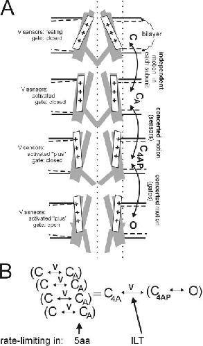 Figure 1. Schematic for Kv motions and kinetics. (A) Section through a bilayer-embedded Shaker in conformations C, CA, C4AP, and O (closed, closed-but-activated, closed-4subunits-activated-plus, open). First, consider the bilayer and the bilayer-protein interface; details of the bilayer's laterally acting forces on Kv channels are unknown, but as Fig 4 of Morris and Laitko (2005) and associated references point out, bilayer forces contribute to conformational equilibria. Insofar as the bilayer thins with stretch (dashed lines in each leaflet) the channel–lipid interface will change (two possibilities are depicted: accommodation on the left, mismatch on the right). Next, the protein conformations themselves. The vertical dotted lines are for positional reference. A closed-resting state (C) is depicted with the voltage sensors in a position stabilized by hyperpolarization. In the closed-activated (CA) states favored by depolarization, the sensors and neighboring domains repack (the motions that yield C1A–C4A are largely independent), but the gates remain shut. Each C→CA subsumes greater complexity (e.g., to describe Shaker WTIR and ILT gating current, two independent steps in series are needed; Ledwell and Aldrich, 1999), which we ignore here. Next are two concerted motions. First four voltage sensors do a final motion together (yielding “activated-plus”). The next concerted step is opening of the tetrameric gate, C4AP→O. B summarizes this as a kinetic scheme showing the voltage-dependent steps. In ILT, the concerted voltage-dependent forward rate C4A→C4AP is rate limiting (Del Camino et al., 2005), whereas in Shaker 5aa, we found (Laitko and Morris, 2004) that independent voltage-dependent steps that we take to be C→CA are rate limiting. In WT channels, the two rates are similar, making it harder to distinguish activation from pore opening. |