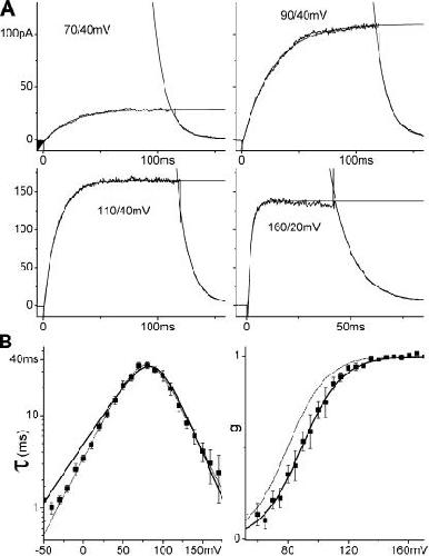 Figure 2. ILT kinetics. (A) Averaged (n = 15 runs) currents from one patch. The membrane was stepped from −90 mV to the first and then to the second voltage indicated. Current activation and decline were fitted with single exponentials. (B) τ(V) from exponential fits and g(V) from tail current amplitudes, averaged results from 16 and 11 patches, respectively, with SEM, and fitted with Eqs. 1 and 3. Both τ(V) and g(V) can be fitted with these expressions over their entire respective voltage ranges, but with slightly different z and K0 that cannot be brought into agreement for the two datasets. Dashed lines: best τ(V) fit (zα = 1.0, z = 2.0, α0 = 0.58 s−1, K0 = 740) and Eq. 3 for g(V) with these parameters. However in the voltage range of ILT activation (60–170 mV, solid lines), z and K0 from the g(V) fit (z = 1.9, K0 = 810) describe τ(V) very well (zα = 1.2, α0 = 0.25 s−1). |