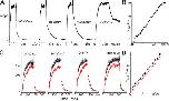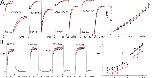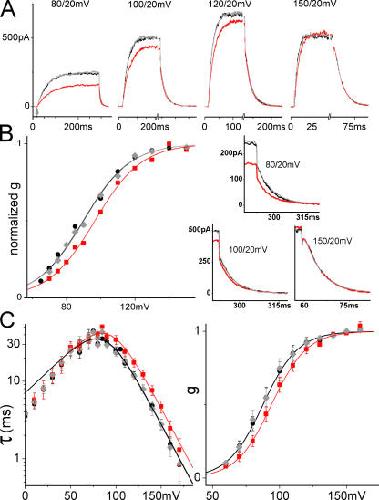 Figure 3. Stretch and ILT currents. Here and for other figures, black (lines or filled circles) = before stretch, red (lines or squares) = during stretch, gray (lines or diamonds) = after stretch. Data from a sample patch. (A) Averaged sample currents (n = 5 runs; repeats were done in succession before moving to another voltage), for steps from −90 mV to the indicated voltage and back to 20 mV, with axis breaks to better visualize the tail. For the leftmost set of currents, an arrow marks the start of the depolarizing step. In all sets, a time scale is provided by labels at t = 0 and at the first major tick (“0” marks the start of recording, not the beginning of a step; the initial flat section is the holding current at −90 mV). Below, at right, for three voltages, tail currents are shown on expanded time scales, as indicated. (B) g(V) relation from tail current amplitudes after stepping back to 20 mV. The fit with Eq. 3 shows that gating charge is unaffected by stretch, whereas K0 increased (z = 1.9, K0 = 700/1170/720 for before/during/after). (C) Averaged τ(V) (seven patches) and normalized g(V) (four patches) with and without stretch, fits with Eqs. 1 and 3 in the range of activation voltages. z and K0 from the g(V) fit (z = 2.0, K0 = 780 without and 1260 with stretch) describe τ(V) very well (zα = 1.3, α0 = 0.18 s−1 without and 0.11 s−1 with stretch). |