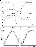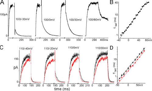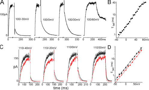 Figure 5. ILT tail currents. (A) Averaged sample currents (n = 10) with exponential fits (fits and data overlap). (B) Tail current time constant vs. voltage on a logarithmic scale. Exponential fit: τ0 = 2.7 ms, z = 1. The data would be situated on the left flank of the τ(V) relation in Fig. 2 B, z here is equivalent to zβ. (C) Averaged samples (n = 3) from a tail current family recorded from a patch with stretch-accelerated tails. (D) τ(V) for that patch, exponential fits: τ0 = 3.3/2.3/ 3.3 ms for before/during/after stretch, z = 0.95 for all. |