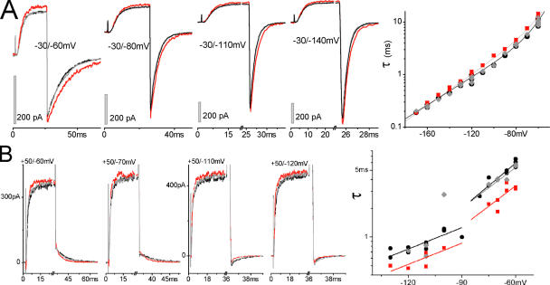 Figure 7. WTIR and stretch. (A) Stretch-slowed tail currents (recorded in hiK) samples and τ(V) with double exponential fit: τ0,1 = 34 ms, z1 = 0.78, τ0,2 = 3.6 s, z2 = 2.8 without stretch, τ0,1 = 62 ms, z1 = 0.88, τ0,2 = 3.4 s, z2 = 2.8 with stretch. (B) Stretch-accelerated WTIR tail currents recorded in normK; τ(V) cannot be fitted with double exponentials. Fits with two separate lines: left branch (before and during [after cannot be fitted]) τ0 = 5.9/4.0 ms, z = 0.44/0.44; right branch (before, during, after): τ0 = 52/25/38 s, z = 0.93/0.85/0.85. |