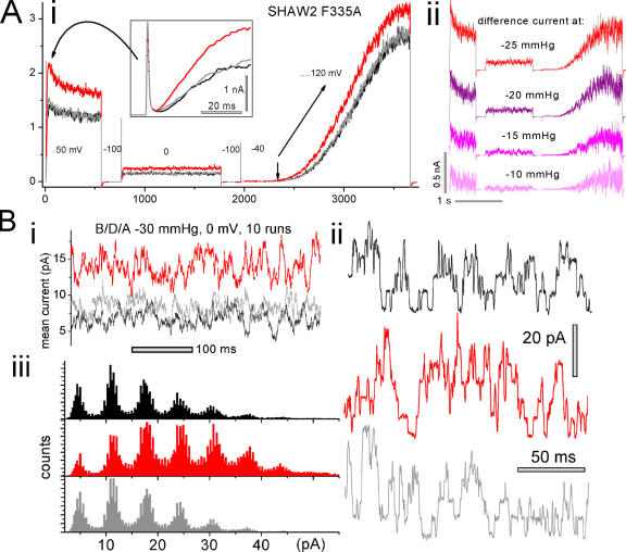 Figure 8. Effects of stretch on Shaw2 F335A. (A i) Shaw2 F335A macroscopic current (single traces) during a multistep protocol (voltages indicated in mV; protocol rationale is given in the text), before, during, and after stretch (using −25 mm Hg). An expanded inset reveals that current onset was sigmoid shaped. (A ii) From the same patch, stretch difference currents at the indicated levels of applied suction (difference currents = [(before + after)/2 – during]). (B) From an oocyte expressing Shaw2 F335A at a low level, (B i) current at 0 mV (10 traces averaged; membrane continuously at 0 mV, using −30 mmHg) before, during, and after stretch. From the same patch (but using −35 mm Hg), (B ii) excerpts from single traces, and (B iii) all-points amplitude histograms from eight runs per condition (i.e., before/during/after stretch) during steps from −100 to 0 mV show that the outward (=upward) unitary current jump amplitude (6.5 pA) was stretch independent. Since for this patch, linear subtraction was not done, interference from the capacitative current was avoided by omitting the first 200 ms of each run for ii and iii. |
