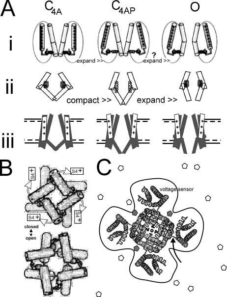 Figure 9. Kv1 structure cartoons. (A i) A cartoon modified from Pathak et al. (2005) depicts the last concerted motion of the voltage sensor exerting a laterally acting (expansion) force within the protein. Subsequently, a concerted relaxation pulls open the channel gate (presumably this expands the hinge region). A ii suggests that the last charge concerted movements could, alternatively, couple to forces that constrict or compact the closed channel (“spring extension”) before a concerted gate region expansion (“spring relaxation”) that opens the pore. To provide context with the kinetic schemes, A iii shows the last two steps from Fig. 1 A. Note that if C4AP is the most expanded state, this is not the factor dominating the stretch responses of ILT (this would not predict the observed stretch deceleration of ILT activation, and it would predict decreased ILT gmax with stretch, which was not observed). As explained in the text, B (modified from Webster et al., 2004) depicts the shutter-like action of the S6 pore hinge as seen from the intracellular space (rings signify the Cd bridges used to locate gating-related helix–helix interactions). The finding of Pathak et al. (2005) that a small concerted S4 movement (<15% of total sensor motion) impels an opening expansion is indicated. The cartoon in C centers on a schematic of an open-like Kv1.2 channel as seen from the extracellular side, adapted from Long et al. (2005a). A curved arrow points to the junction of sensor and pore modules in the primary structure. A perimeter line highlights the fact that the interface (i.e., amino acid residues interacting with bilayer lipid molecules on the z axis) is more extensive than for, say, a cylindrical tetramer. Bilayer stretch would alter the z axis LPP along this entire x,y perimeter. Surface active molecules (white and gray pentamers) whose mobility dropped at loci on the channel perimeter (gray molecules) could alter LPPs and hence conformational equilibria in excess of what would be predicted solely from the line tension due to bulk (white) molecules (Ly and Longo, 2004), making some distinctions between low-affinity binding effects and bilayer mechanical effects largely semantic. |