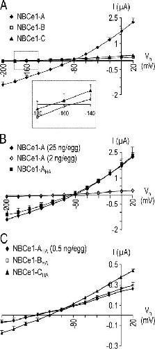 Figure 4. I-V relationships of the three NBCe1 variants. (A) HCO3−-dependent I-V plots were obtained from oocytes expressing NBCe1-A (closed diamonds), NBCe1-B (open squares), and NBCe1-C (closed triangles). For each data point, n ≥ 11. (Inset) The I-V plots are magnified near the reversal potentials (IM = 0) for NBCe1-B and C. (B) HCO3−-dependent I-V plots from oocytes injected with 25 ng of NBCe1-A cRNA (closed diamonds, redrawn from A), 2 ng of NBCe1-A cRNA (open diamonds, n = 3), or 25 ng of HA-tagged NBCe1-AHA cRNA (closed squares, n = 6). (C) HCO3−-dependent I-V plots from oocytes injected with 0.5 ng of NBCe1-AHA cRNA (closed diamonds, n = 3), 25 ng of NBCe1-BHA cRNA (open squares, n = 4), or 25 ng of NBCe1-CHA cRNA (closed triangles, n = 4). Error bars smaller than symbols are not shown.
