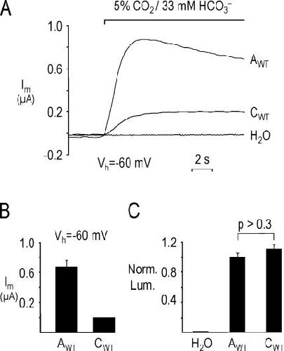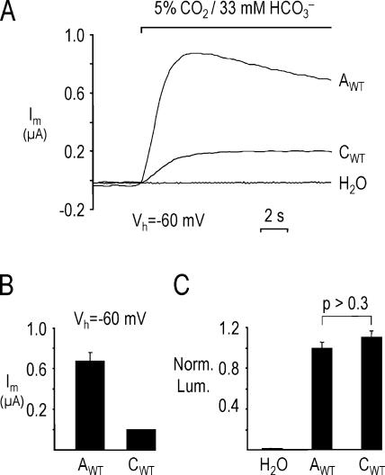 Figure 5. Larger HCO3−-induced currents in oocytes expressing NBCe1-A than NBCe1-C. (A) A 5% CO2/33 mM HCO3− solution elicited an outward current in the NBCe1-A–expressing oocyte (AWT) that was 4.5-fold higher than the current in the NBCe1-C-expressing oocyte (CWT). An H2O-injected oocyte displayed no HCO3−-induced outward current. (B) Summary of H2O-subtracted, HCO3−-induced currents from experiments similar to those shown in A. n ≥ 7 from two batches of oocytes. (C) The mean normalized luminescence (Norm. Lum.) was similar for the A and C variants. n ≥ 12 from two batches of oocytes.