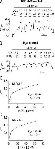 Figure 6. External HCO3−-dependencies of NBCe1-B and -C. (A) A voltage-clamped oocyte (Vh = −60 mV) expressing NBCe1-C was exposed to different HCO3−-containing solutions at a constant [Cl−] of 7.6 mM. (B) The experimental protocol used in A was performed on an H2O-injected oocyte. (C) Normalized HCO3−-induced currents as a function of external [HCO3−] for oocytes expressing NBCe1-B (r2 = 0.99). HCO3−-induced outward currents in experiments similar to that in A were normalized to the mean currents elicited by the flanking exposures to the standard 5% CO2/33 mM HCO3− solution. (D) Normalized HCO3−-induced currents as a function of external [HCO3−] for oocytes expressing NBCe1-C (r2 = 0.99).