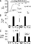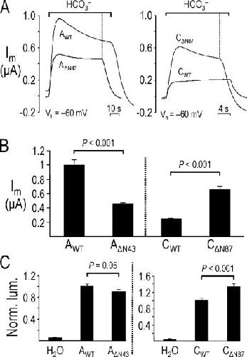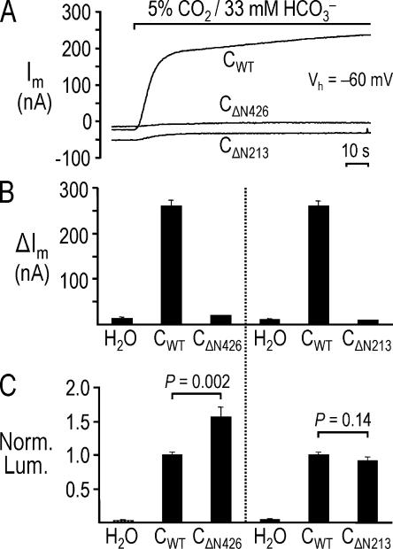 Figure 8. Inhibited NBCe1 activity elicited by removing regions of the cytosolic amino terminus. (A) Exposing oocytes to a solution containing 5% CO2/33 mM HCO3− elicited an outward current in the oocyte expressing wild-type NBCe1-C (CWT), but little/no current in the oocyte expressing either CΔN426 or CΔN213. (B) Summary of HCO3−-induced outward currents from experiments similar to those shown in A. For each bar, n ≥ 3 from two batches of oocytes. SEM values for the CΔN426 or CΔN213 data are small. (C) Compared to the mean normalized luminescence (Norm. Lum.) for CWT, mean Norm. Lum. was 1.5-fold greater for CΔN426, and similar for CΔN213 in oocytes from the same two batches in B. n ≥ 10 for each bar.