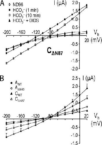 Figure 10. Current–voltage (I-V) relationships from oocytes expressing wild-type and amino-terminal truncations of NBCe1 variants. (A) Representative experiment on an oocyte expressing CΔN87 in which I-V plots were obtained with the oocyte initially bathed in ND96 (diamonds), followed by 1 min in 5% CO2/33 mM HCO3− (circles) and then 10 min in the physiological buffer (squares), and finally in the HCO3− solution containing 200 μM DIDS (triangles). (B) HCO3−-dependent I-V plots for NBCe1-A (closed diamonds), AΔN43 (open diamonds), NBCe1-C (closed triangles), and CΔN87 (open triangles). Data were obtained from experiments similar to that shown in A. n = 3 for each data point from a single batch of oocytes. SEM bars smaller than symbol sizes are not shown. Similar results were obtained from a second batch of oocytes.