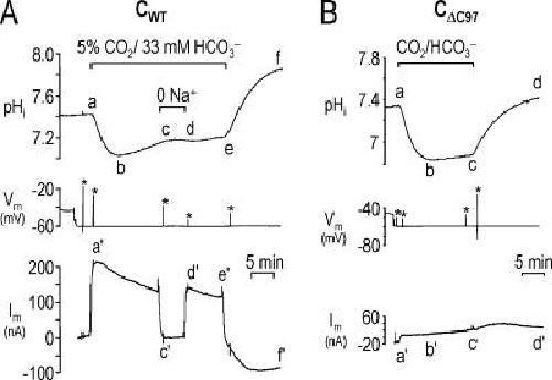 Figure 11. Lost activity of CΔC97 expressed in oocytes. (A) pHi (top trace), voltage (middle trace), and current (bottom trace) were measured simultaneously in an NBCe1-C–injected oocyte that was initially bathed in ND96. The oocyte was then voltage clamped and exposed to a solution containing 5% CO2/33 mM HCO3− during segment ae. Electrogenic NBC activity was evident from the instantaneous outward current (a'), and the pHi recovery (bc) following the initial CO2-induced acidification (ab). Removing Na+ blocked the pHi recovery (cd), and reversed the hyperpolarization (c'). (B) The same experimental protocol in A was performed on a CΔC97-injected oocyte. Exposing the oocyte to CO2/HCO3− elicited only a small outward current (a'), and minimal pHi recovery (bc) following the initial decrease in pHi (ab).